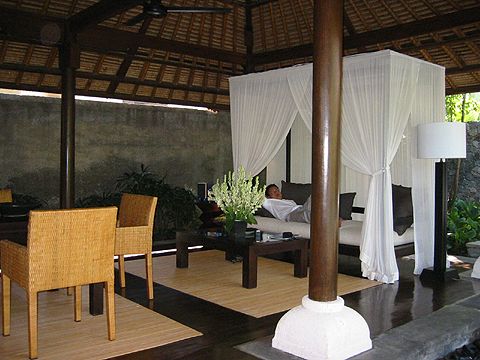 泳池邊就是客廳,還有露天的發呆亭,附蚊帳喔!